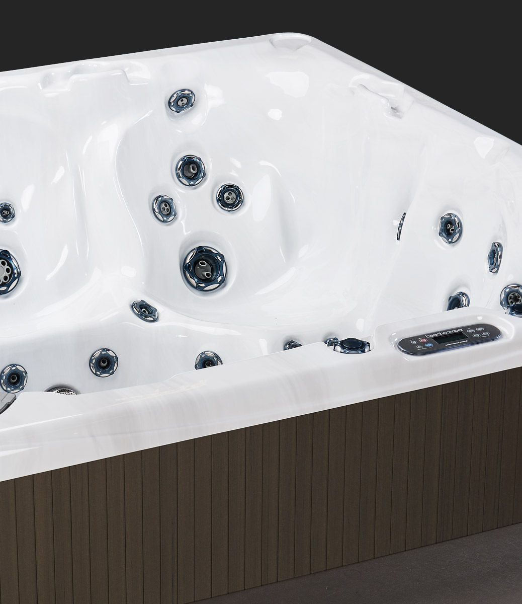 For those who like to entertain, this beautiful and highly efficient tub provides is the perfect destination. The 750 is loaded with the most features for incredible hydro massages, luxury seating for 8, 1 cooling seat, and up to 192 fully customizable jets. Just be careful, once people enter this vacation, they may never want to leave. Upgrade to a Hybrid4 for more energy saving options.