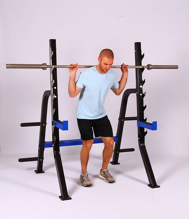 The Xplode 225 Squat Rack is a commercial grade rack, designed for heavy usage. The 8 different gun positions provides safe use without the need for a spotter and gives the user the ability to walk the bar up and down without removing plate weights. The 4 storage posts allow for quick and easy access to your weight plates while keeping your workout area organized.